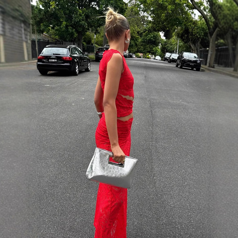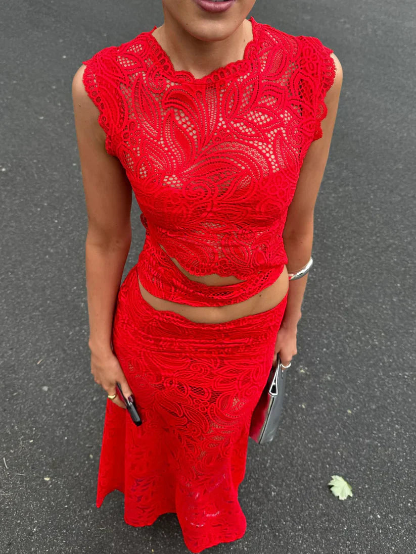 Aria™ transforme chaque sortie en moment de confidence et de style assumé. Ce deux-pièces en dentelle rouge vibrante épouse ta silhouette avec une coupe sculptante : un crop top structuré et une jupe taille haute élégante qui subliment chaque courbe. Les détails délicats captent la lumière, créant un look à la fois audacieux, raffiné et féminin. Parfait pour une soirée d’été, un rooftop entre amis ou un événement chic — Aria te fait briller sans effort.