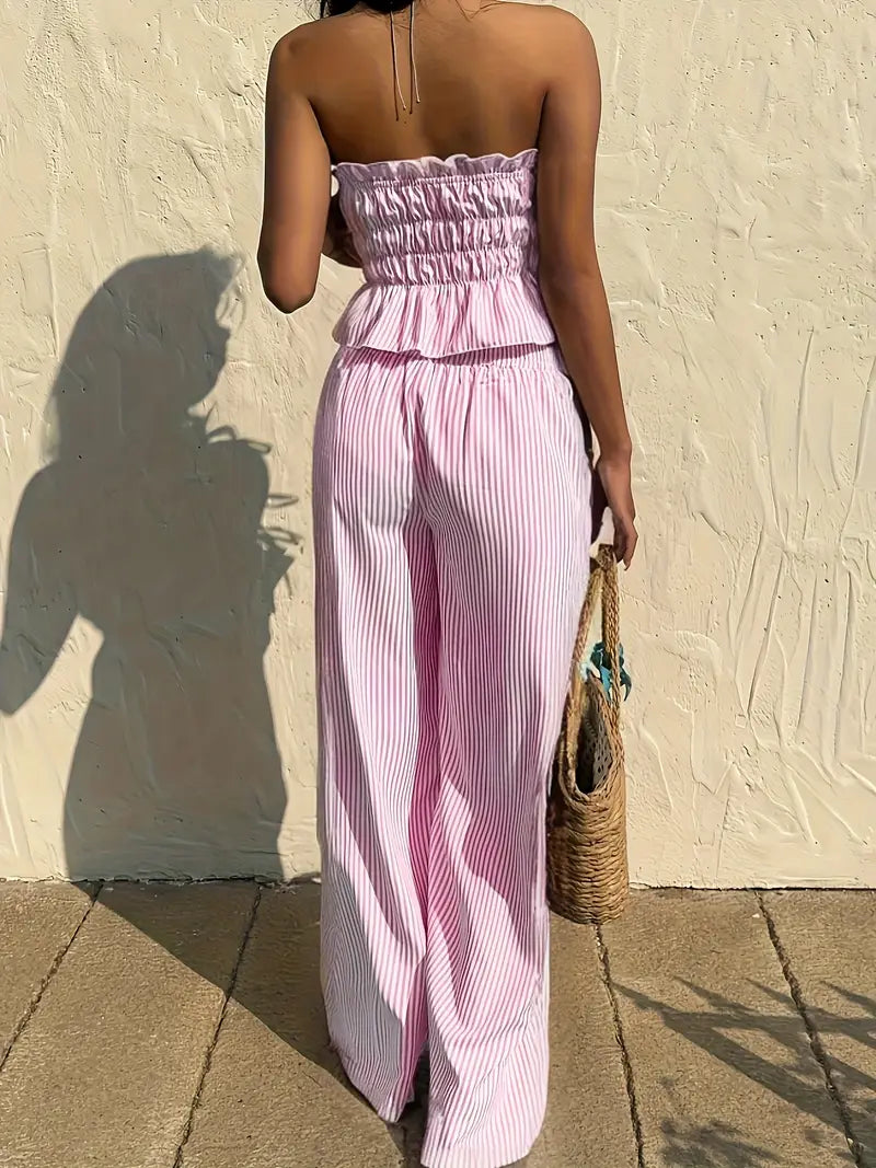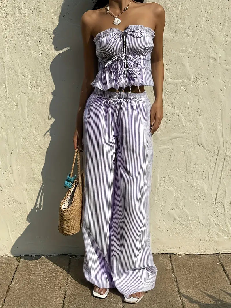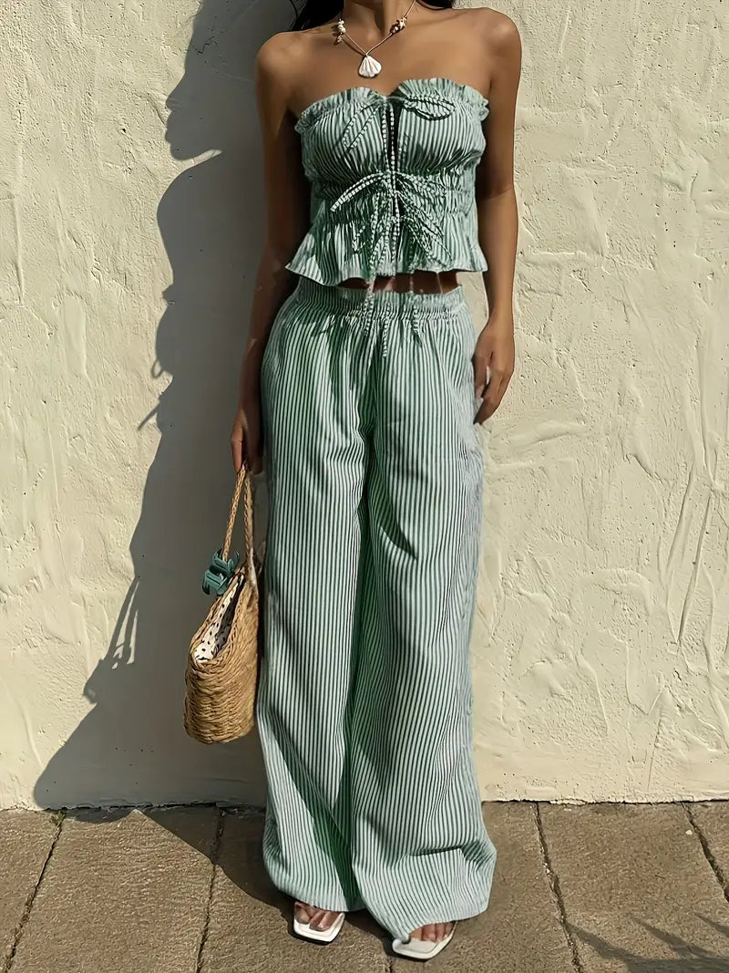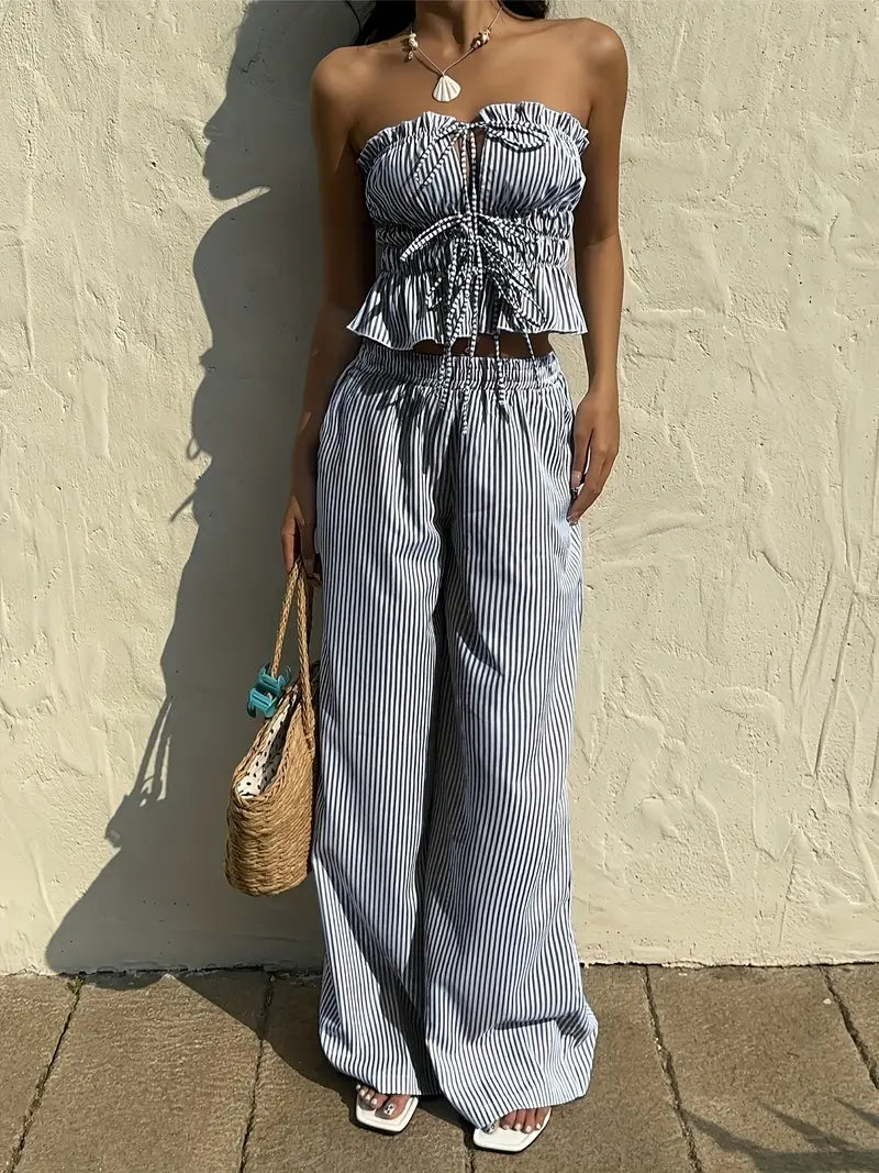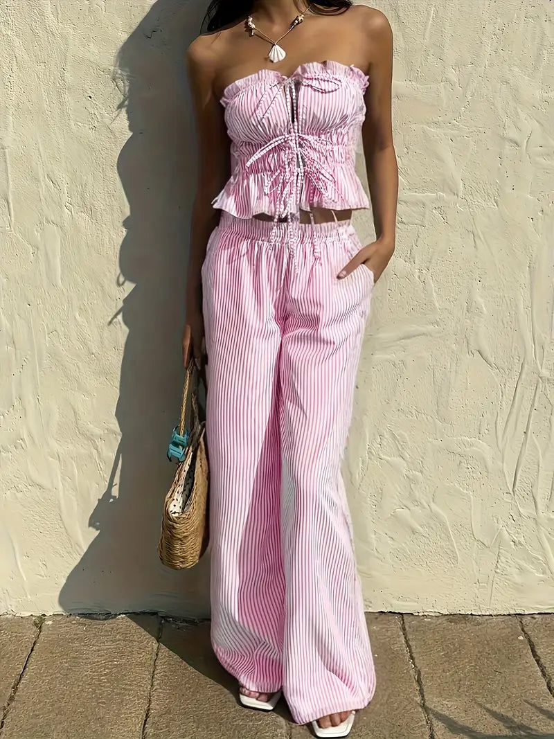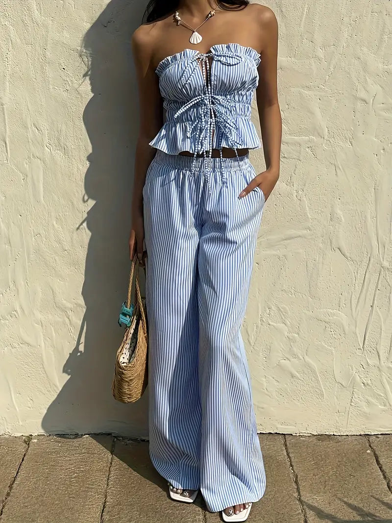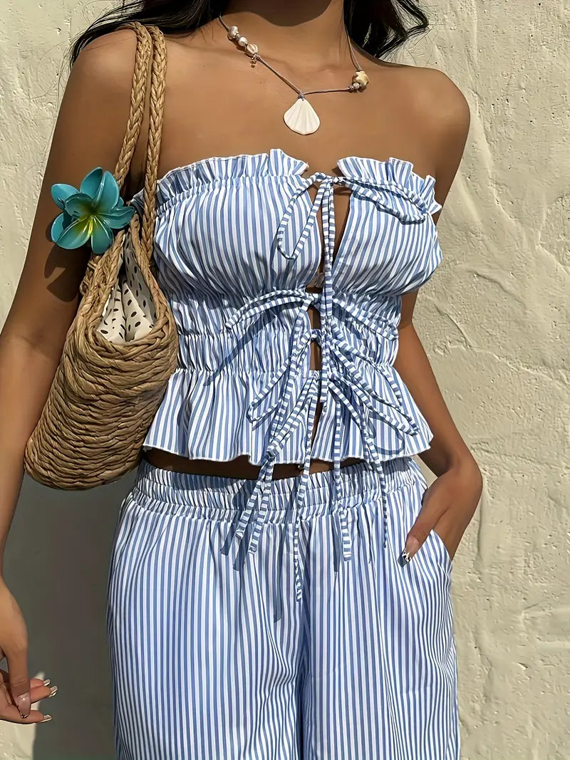 Cet ensemble d’inspiration coréenne combine un haut bustier à volants noué et un pantalon taille haute fluide pour un style à la fois chic et détendu. Sa coupe légère sans manches te permet de rester au frais tout en affirmant ton style avec confiance. Parfait pour les vacances, les sorties entre amies ou une promenade en ville sous le soleil.